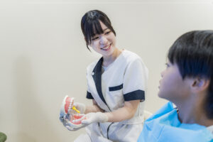 お子さまの歯の状態は年齢とともに大きく変化します。乳歯のむし歯予防から永久歯への生え変わり、さらに将来の歯並びや噛み合わせの管理に至るまで、長期的な視点で診ていくことが重要です。当院では女性スタッフが中心となって、年齢ごとのアドバイスを保護者に丁寧にお伝えしています。例えば「仕上げ磨きはいつまで必要か」「おやつの選び方はどうしたら良いか」といった質問にも、そのご家庭に合わせた現実的な提案を行っています。こうした積み重ねが、安心して通える小児歯科としての信頼につながっています。